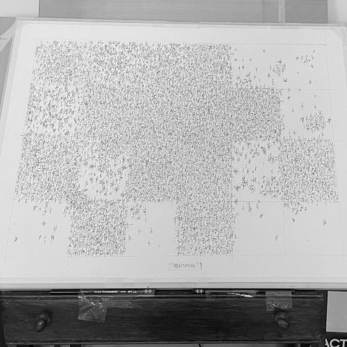 A central idea to the work is that all pieces look almost identical from across the room, but are individually very different close up. A metaphor for the human condition.