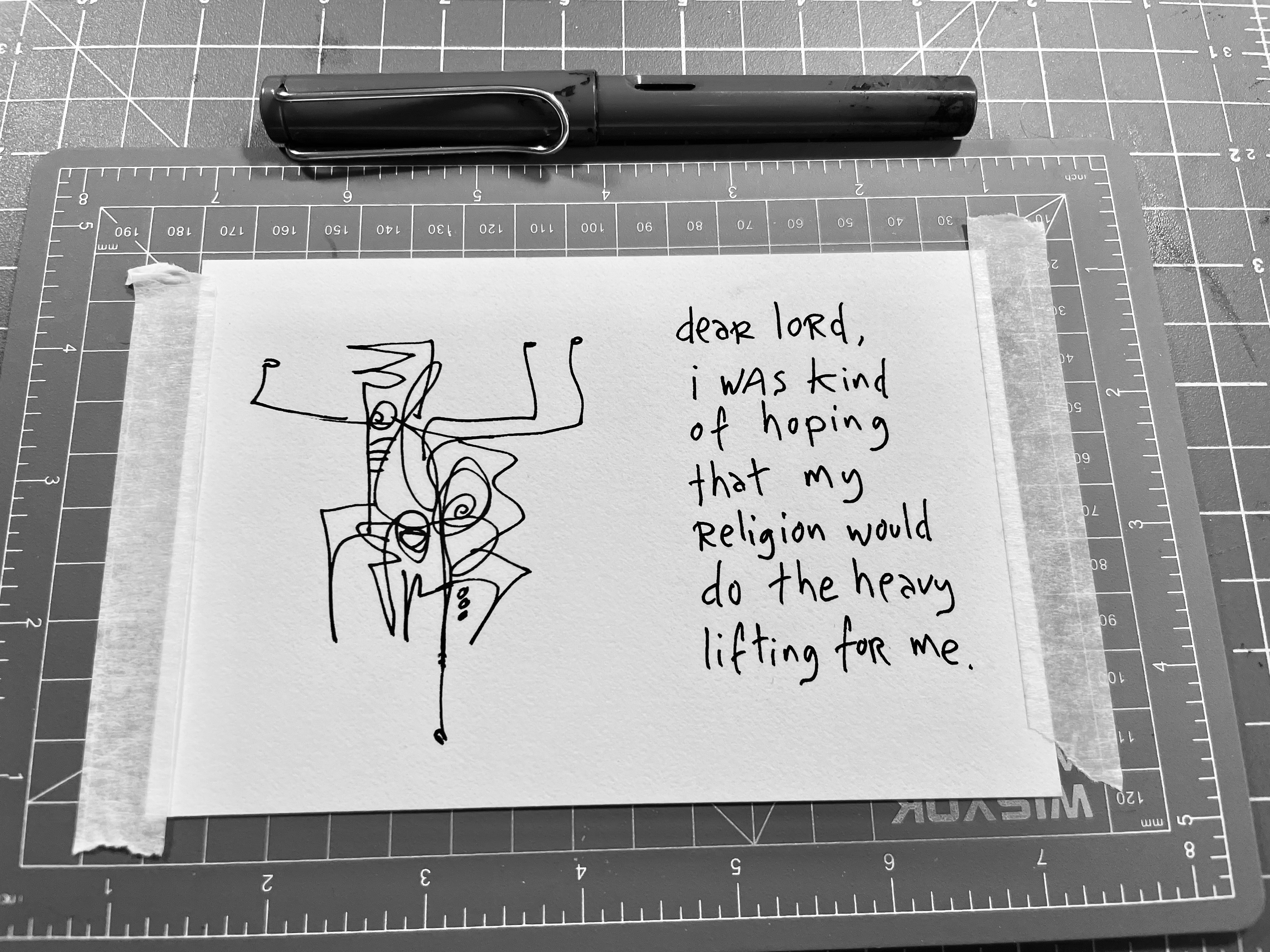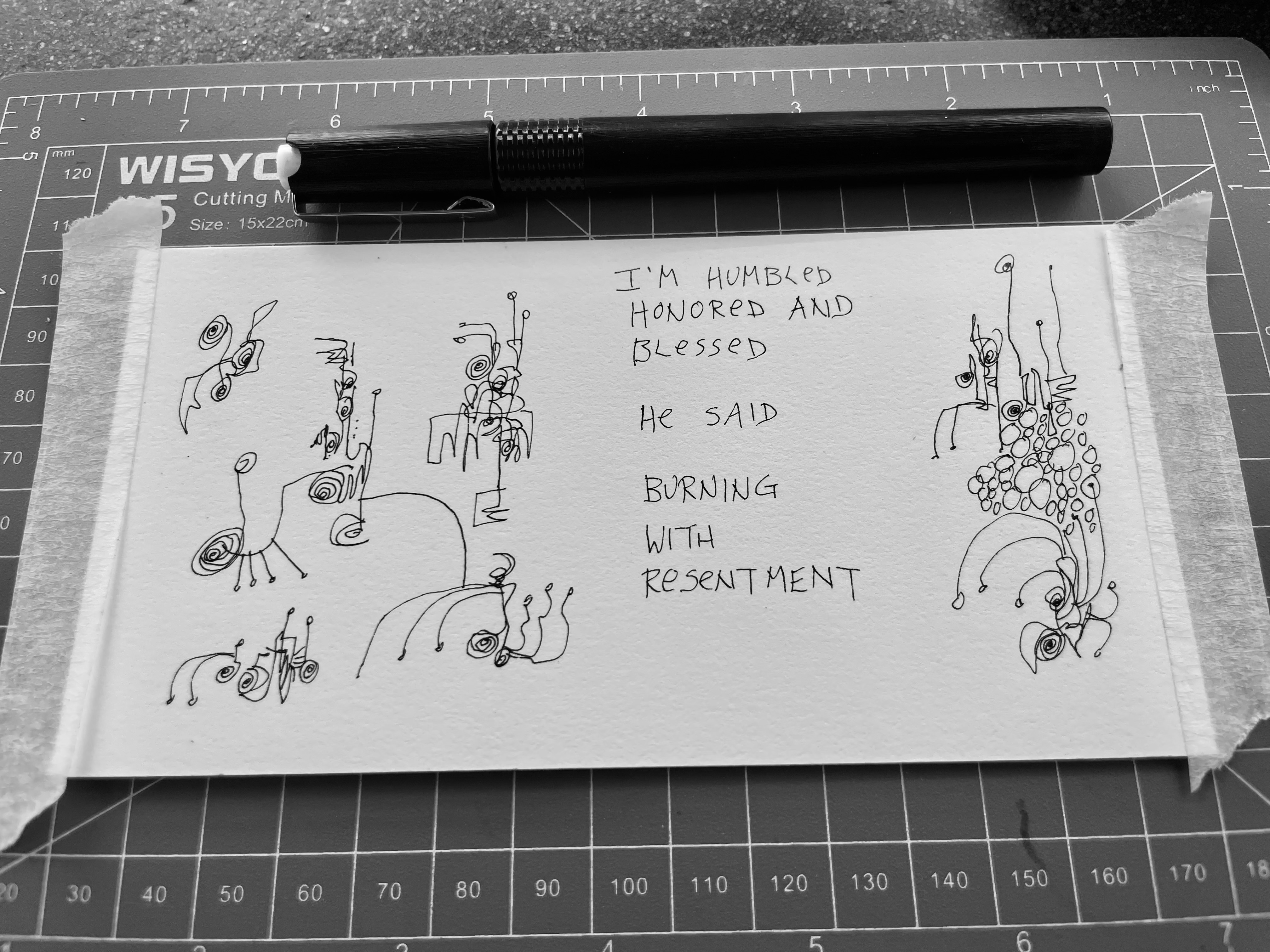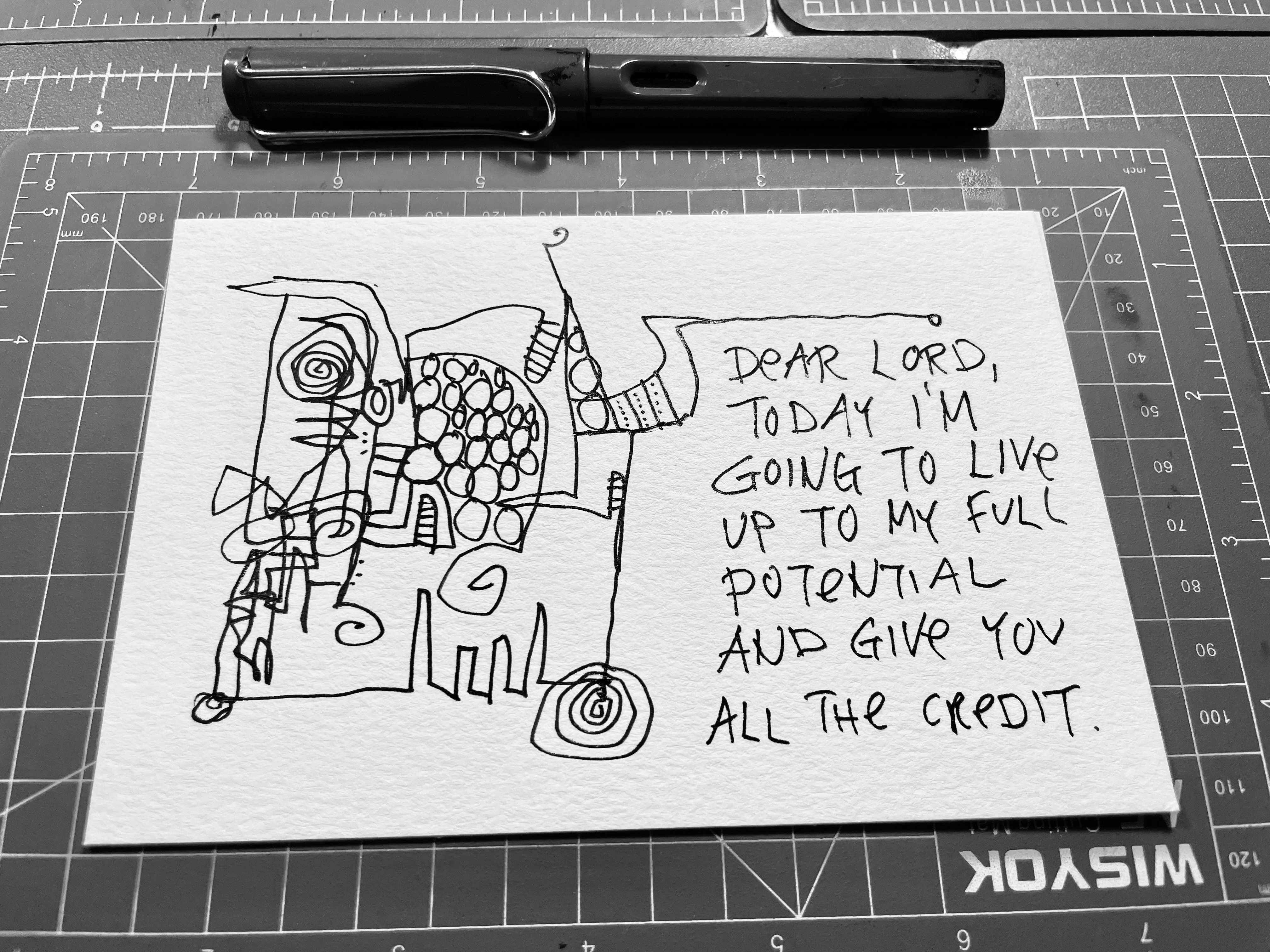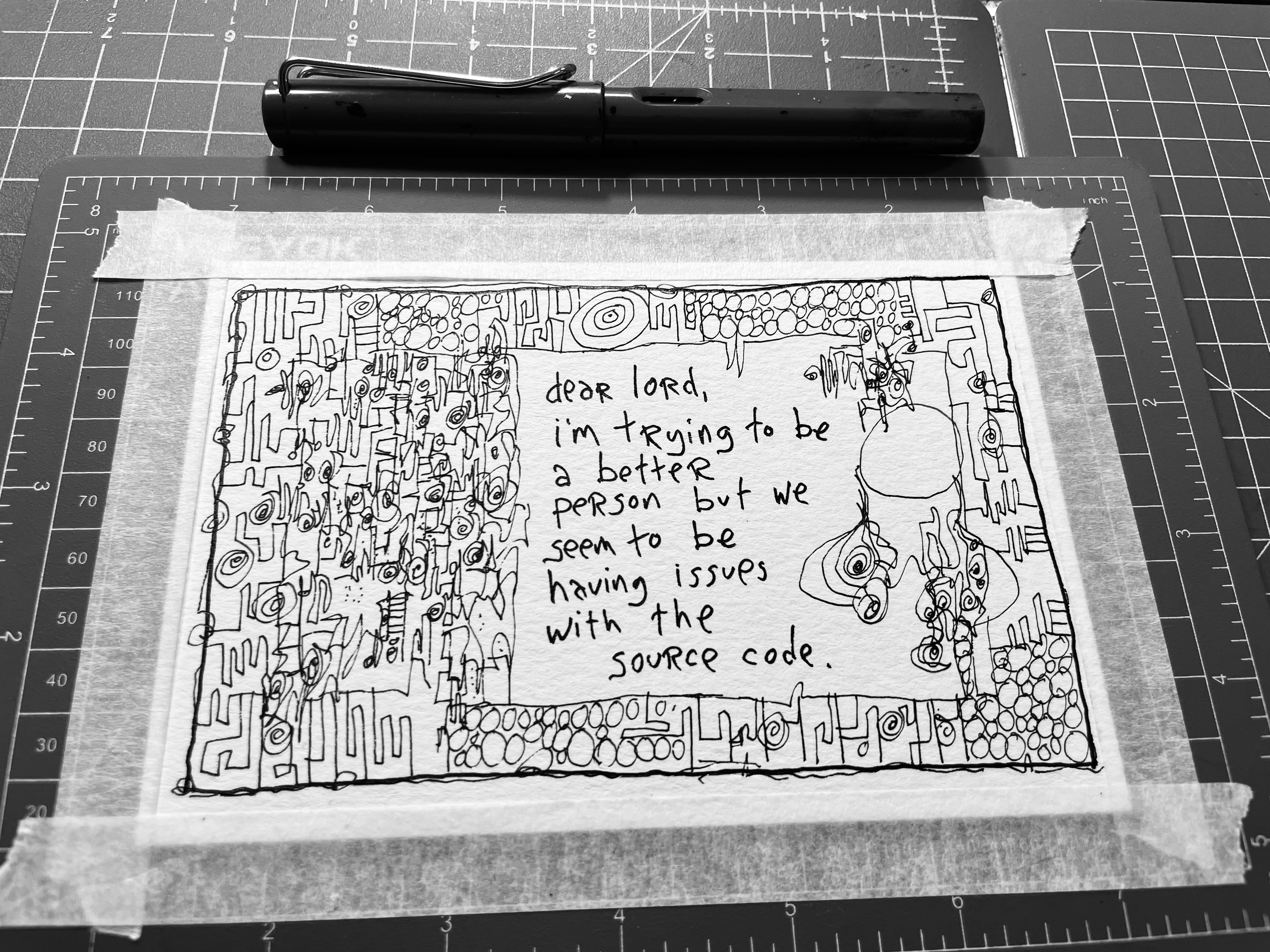 No shortcuts: All pieces are done entirely by myself, no assistants, every pen stroke my own. No prints, no “entry level” offerings, no smaller drawings (except when drawing in my sketchbook during my 10-minute morning warmup).